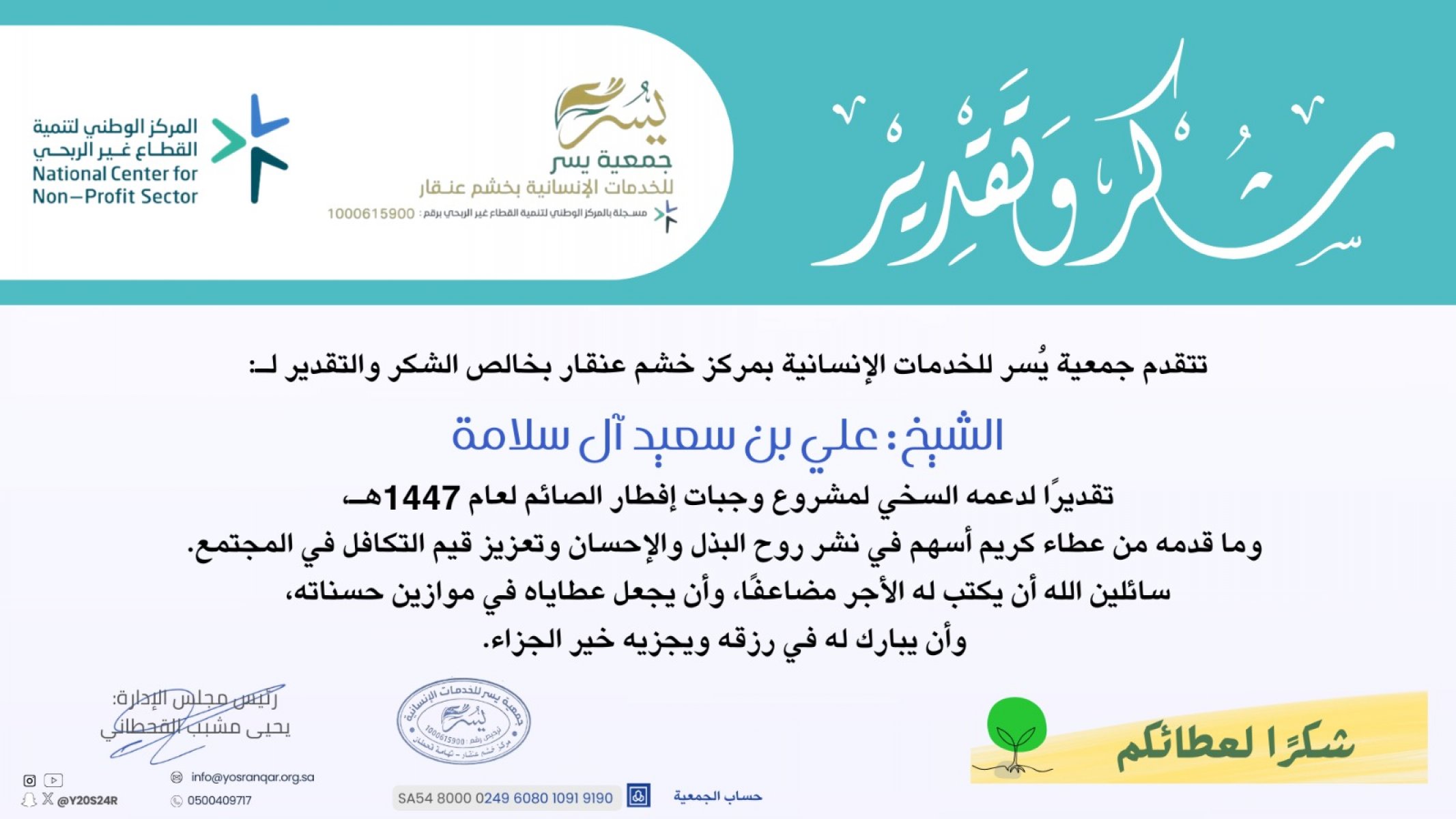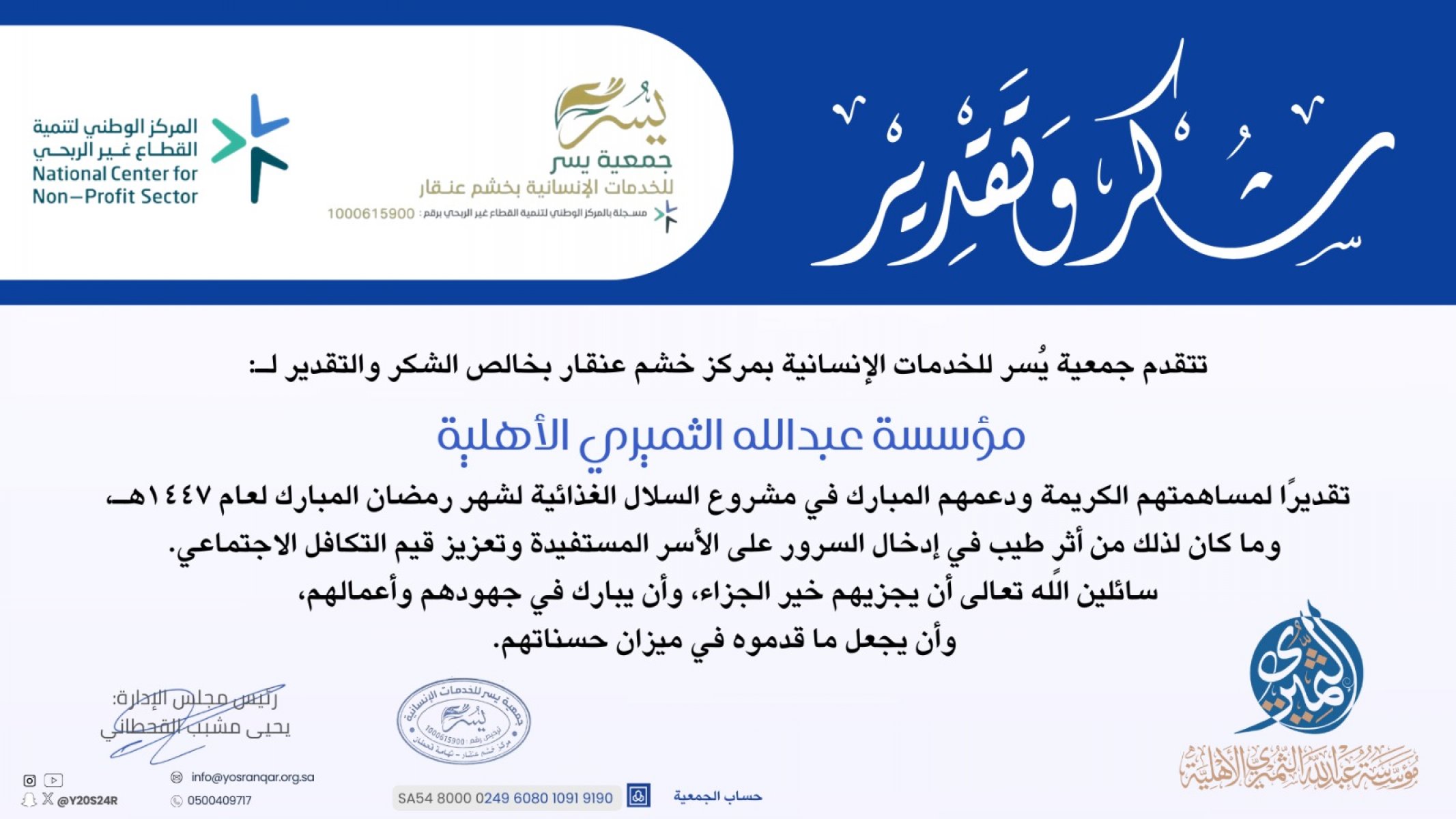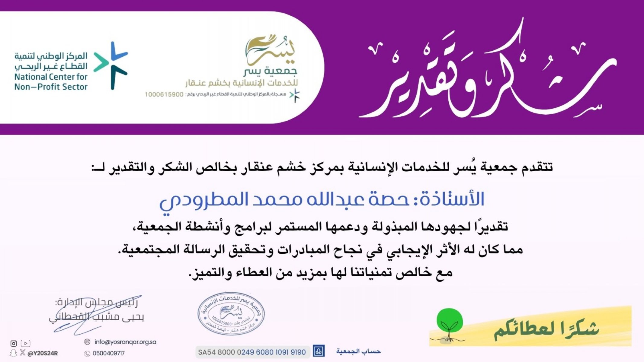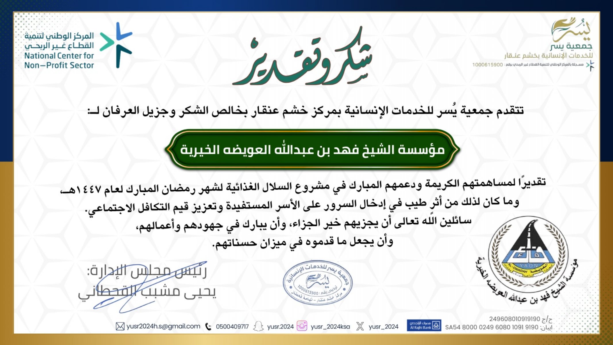 مبادرة لشكر وتقدير الداعمين من جهات مانحه او افراد او جمعيات خيرية ، ومشاركتهم لنا فيبرامجنا لتعزيز المسؤولية الاجتماعية وقيم المجتمع السعودي المتلاحم .