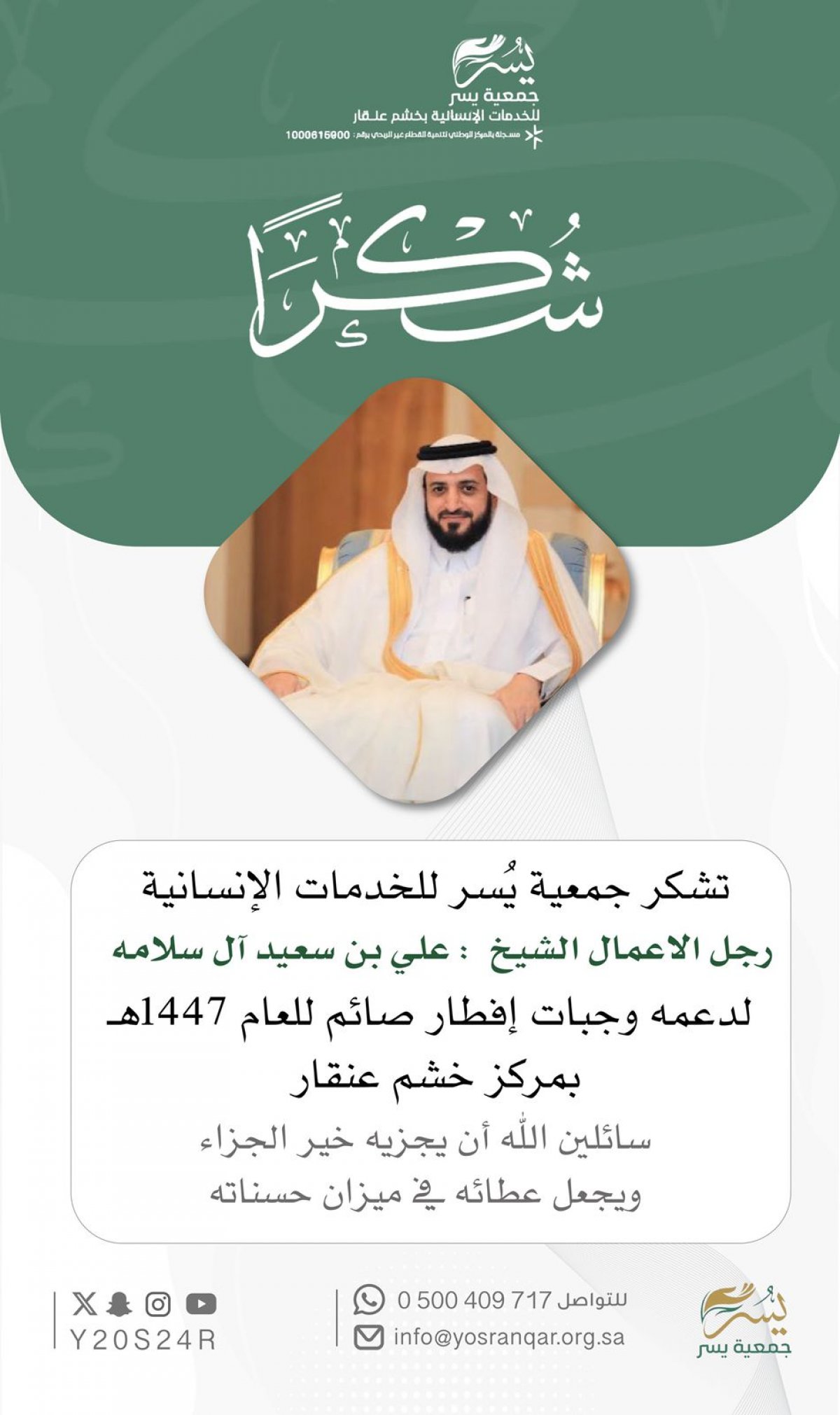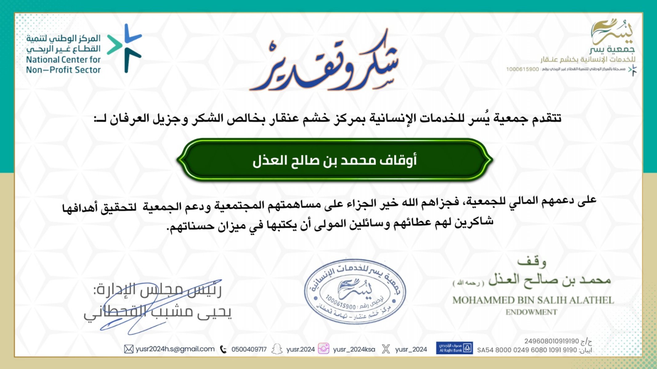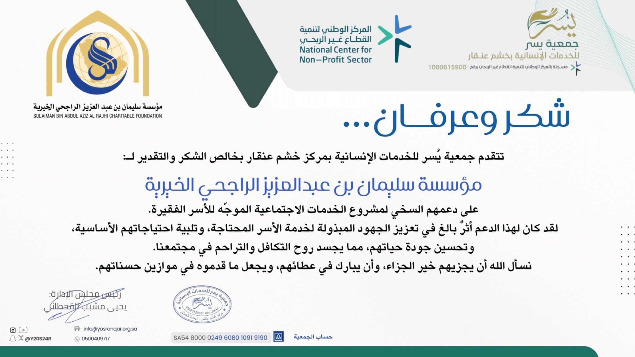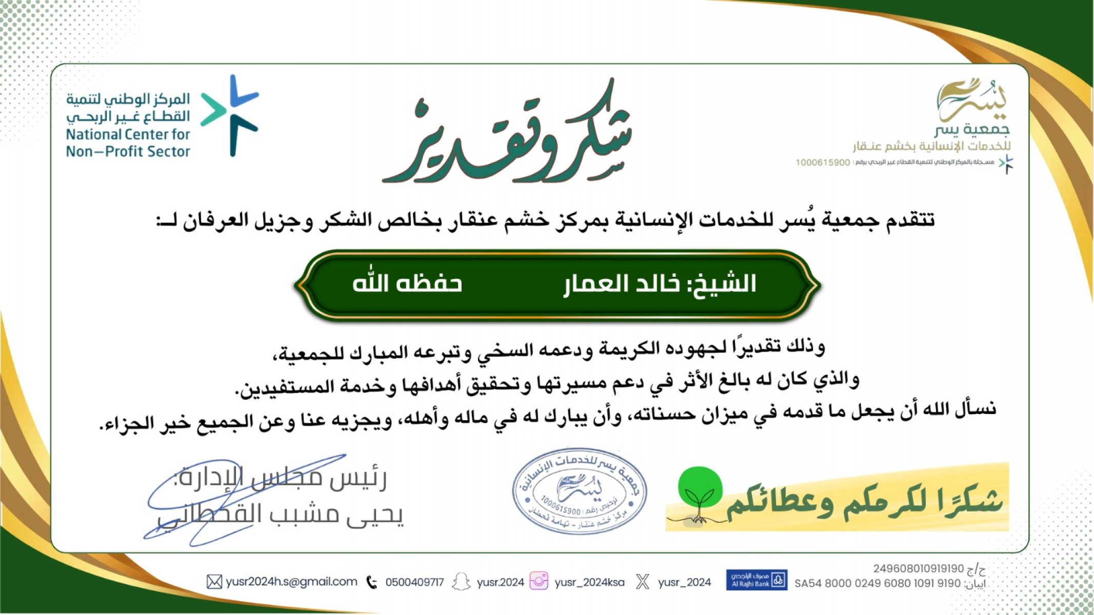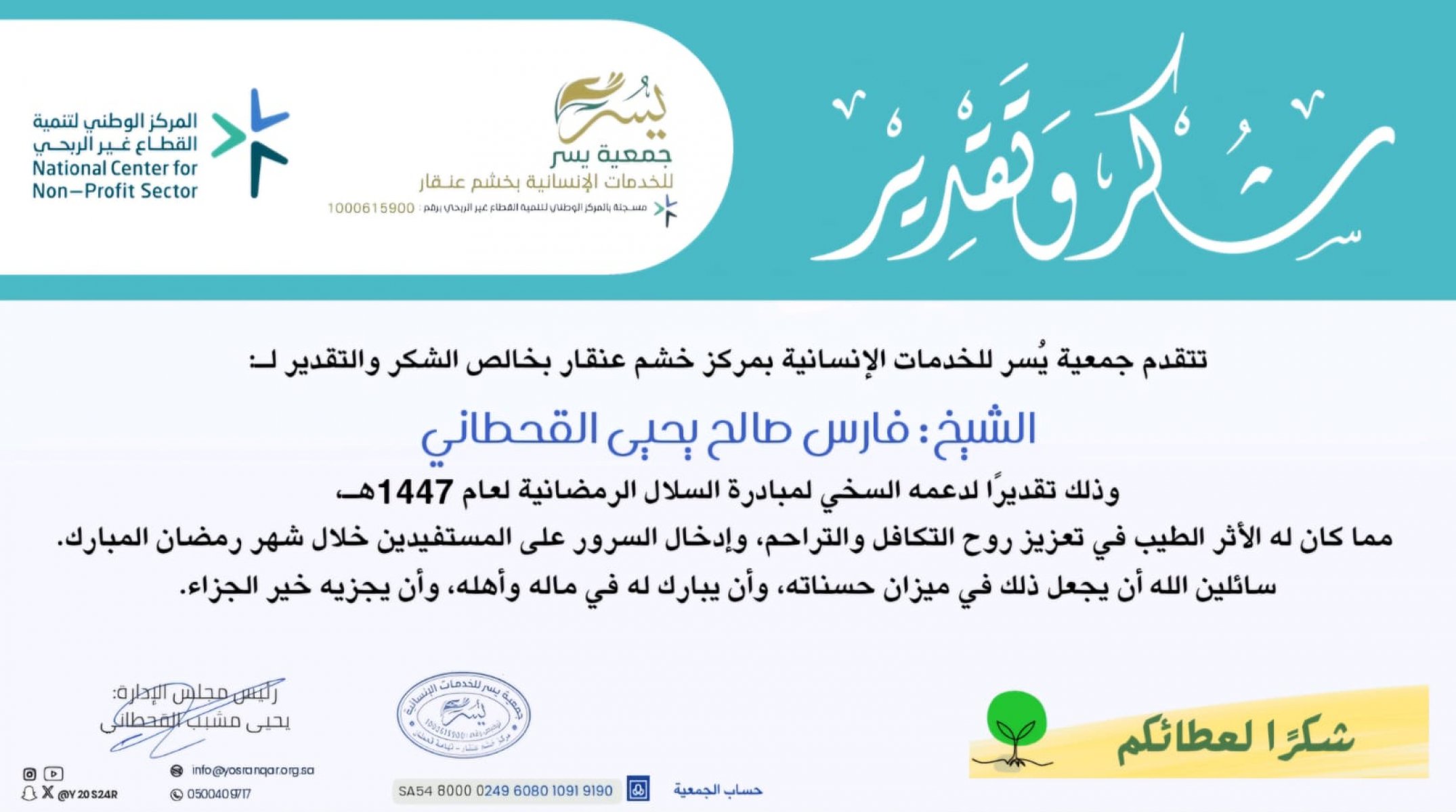 مبادرة لشكر وتقدير الداعمين من جهات مانحه او افراد او جمعيات خيرية ، ومشاركتهم لنا فيبرامجنا لتعزيز المسؤولية الاجتماعية وقيم المجتمع السعودي المتلاحم .