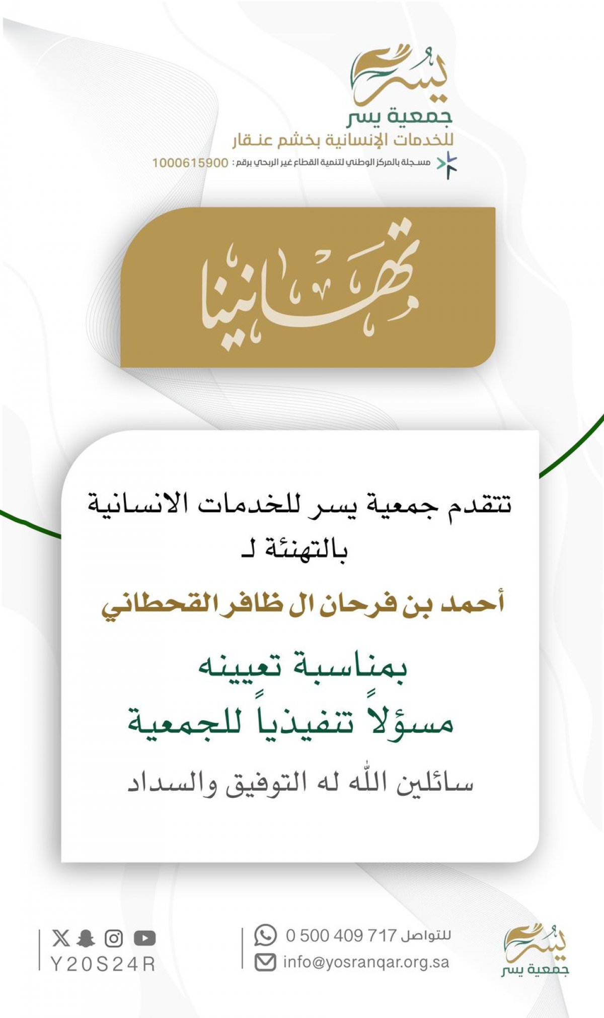 نبارك للاستاذ الفاضل : احمد فرحان يحي ال ظافر القحطاني تعيينه مديرا تنفيذيا لجمعية يسر للخدمات الانسانية بمركز خشم عنقار اعتبارا من 1/1/2026 سائلين الله له التوفيق والسداد